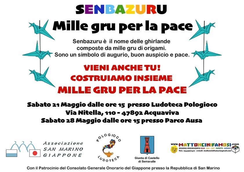 Per questo l’Associazione San Marino - Giappone, in collaborazione con Ludoteca Pologioco, Mattoncini Famosi, la Giunta di Castello di Serravalle ed il Patrocinio del Consolato Onorario del Giappone presso la Repubblica di San Marino vuole organizzare una giornata all’insegna della pace per i bambini e le famiglie, con lo scopo di creare quante più gru di origami possibile e comporre insieme una ghirlanda di origami come messaggio di pace.